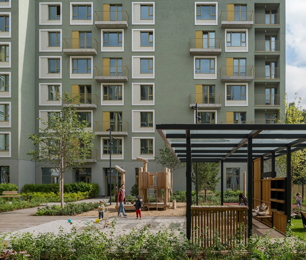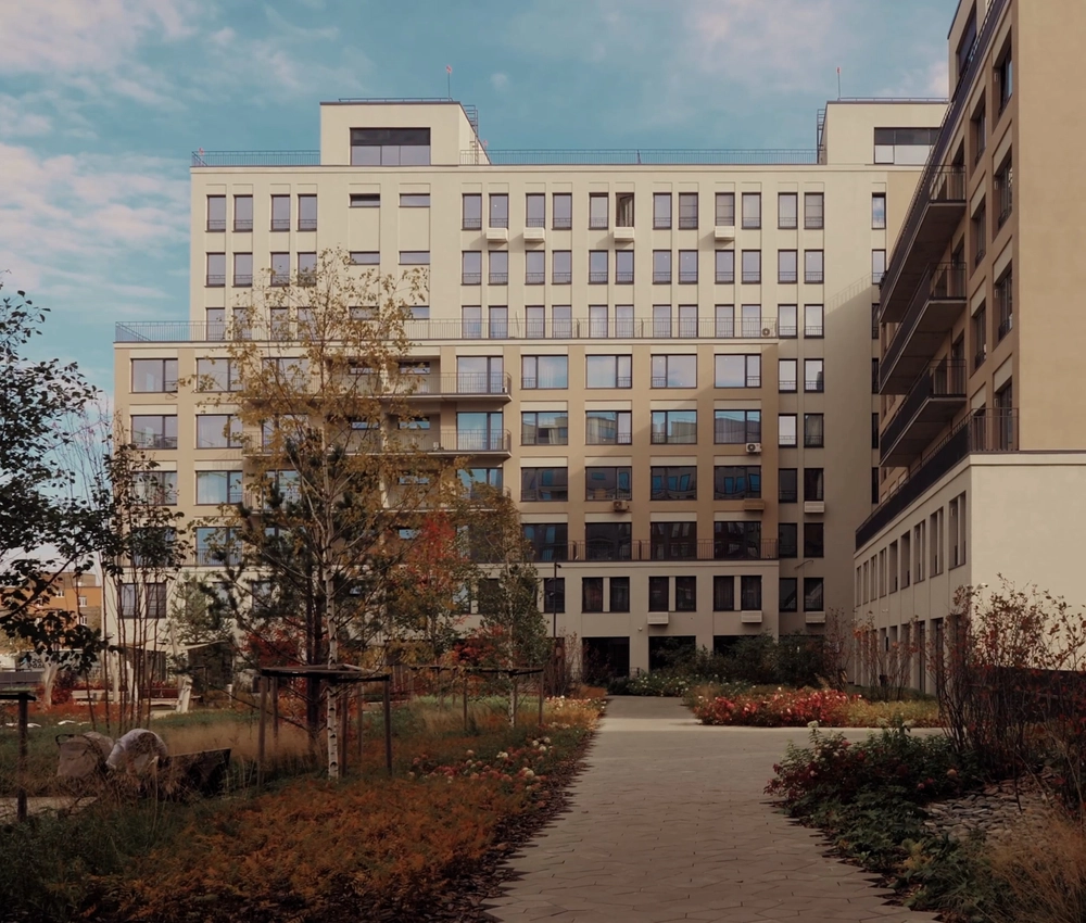 Жилой квартал с собственным спортивным стадионом, многофункциональными общественными пространствами и общеобразовательной школой в пешей доступности.