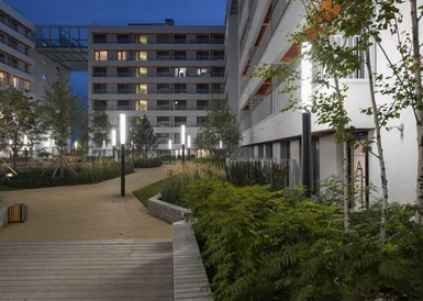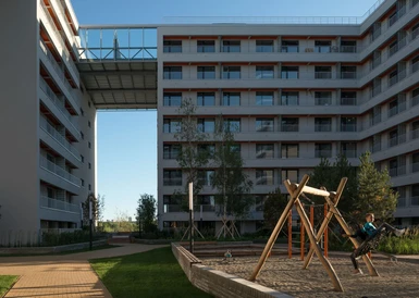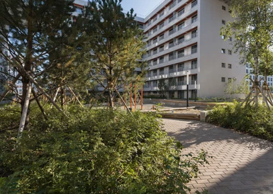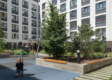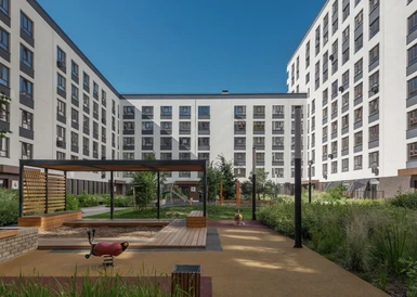 Жилой квартал с собственным спортивным стадионом, многофункциональными общественными пространствами и общеобразовательной школой в пешей доступности.