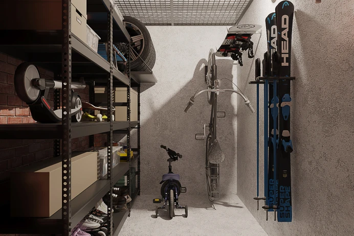 Кладовые помещения расположены на цокольных этажах домов. Вход организован со двора. Доступ осуществляется по магнитному ключу. Для безопасности во дворе и на входе в цокольные этажи установлены камеры видеонаблюдения. Кладовые помещения сделаны из кирпича, установлена металлическая противопожарная дверь с замком. Есть свет и тепло. В кладовых можно хранить инструменты, зимнее снаряжение, шины, надувные лодки, другие изделия для организации отдыха и то, что не пригодилось при переезде. Благодаря плюсовой температуре беспокоиться за сохранность вещей не придётся.