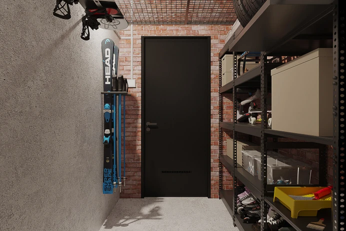 Кладовые помещения выполнены из керамзитоблока 90 мм. На входе установлена металлическая противопожарная дверь.